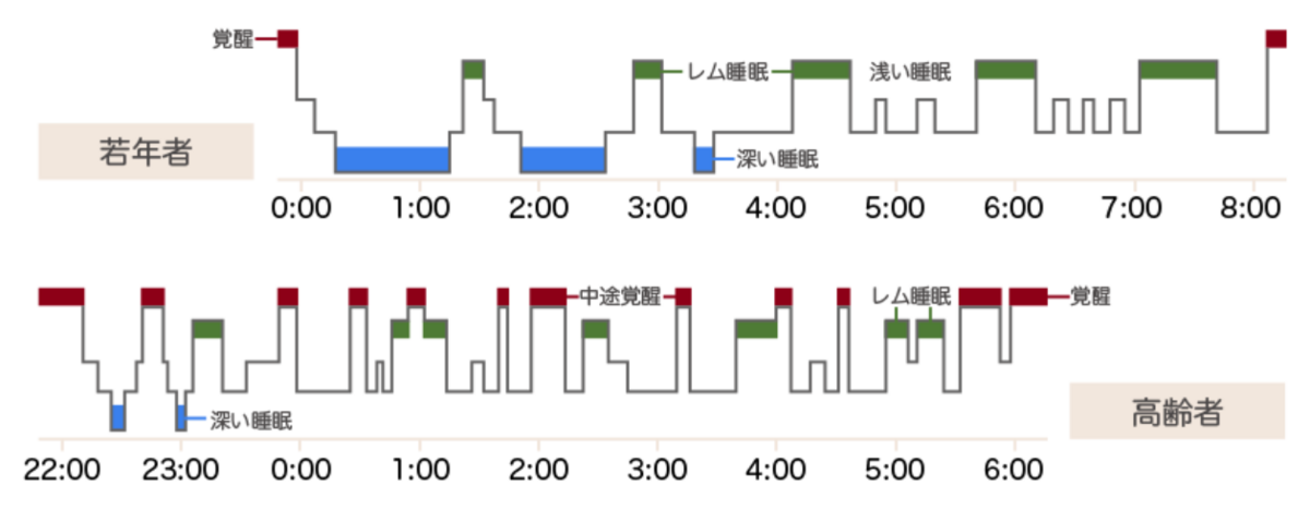 睡眠と彼について興味深いサイトを見つけました。厚生労働省のサイトでした。そこで紹介されていたのが、若年層と高齢者の睡眠を比較した下記のグラフです。