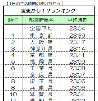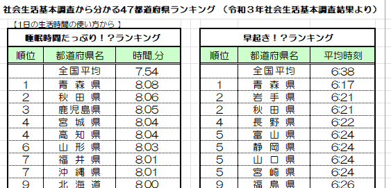 このデータは、総務省統計局の資料をもとに日本人の平均睡眠時間を調べたもの(2021年公表)。下図のように各都道府県別にランキング形式で睡眠時間の平均値を公表しています。 www.stat.go.jp