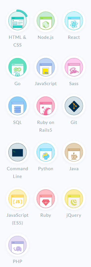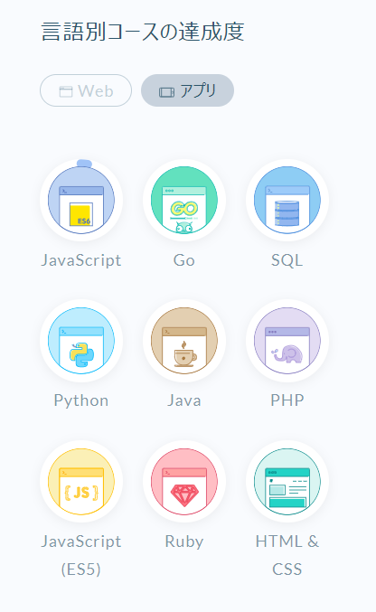 学べる言語は下図の通り、16言語あります。ホームページの動きを作るJavaScriptは新旧両方が学べます。これまで何度もチャレンジして放置しているPythonもあります。最後までやり遂げたいと思います。