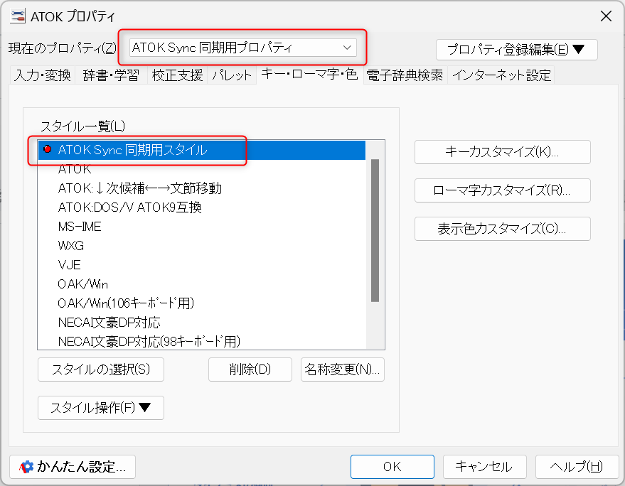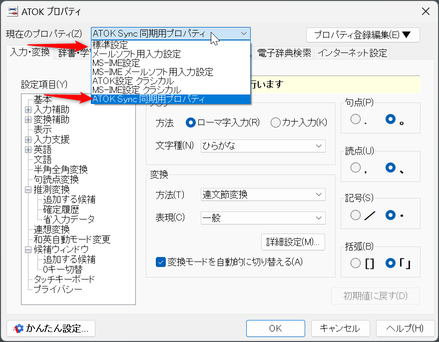 これまで使ってこなかった機能、「現在のプロパティ」が標準設定になっていました。現在は「ATOK Sync同期用プロパティ」しましたが、私が確認したときは標準設定になっていました。