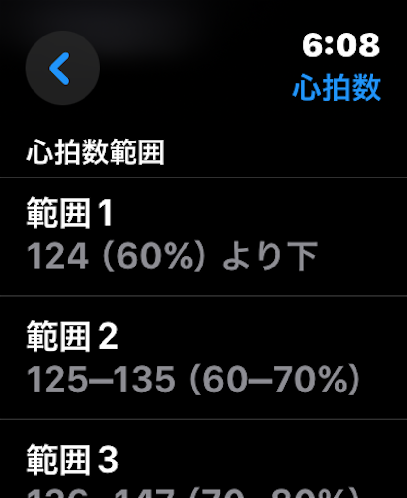 Apple Watchは自動的に心拍数の範囲を設定してくれています。範囲1は軽い強度、範囲2は中強度とほぼ同じなので、Apple Watchの心拍数を範囲1~範囲2にすることで、初心者には十分なようです。