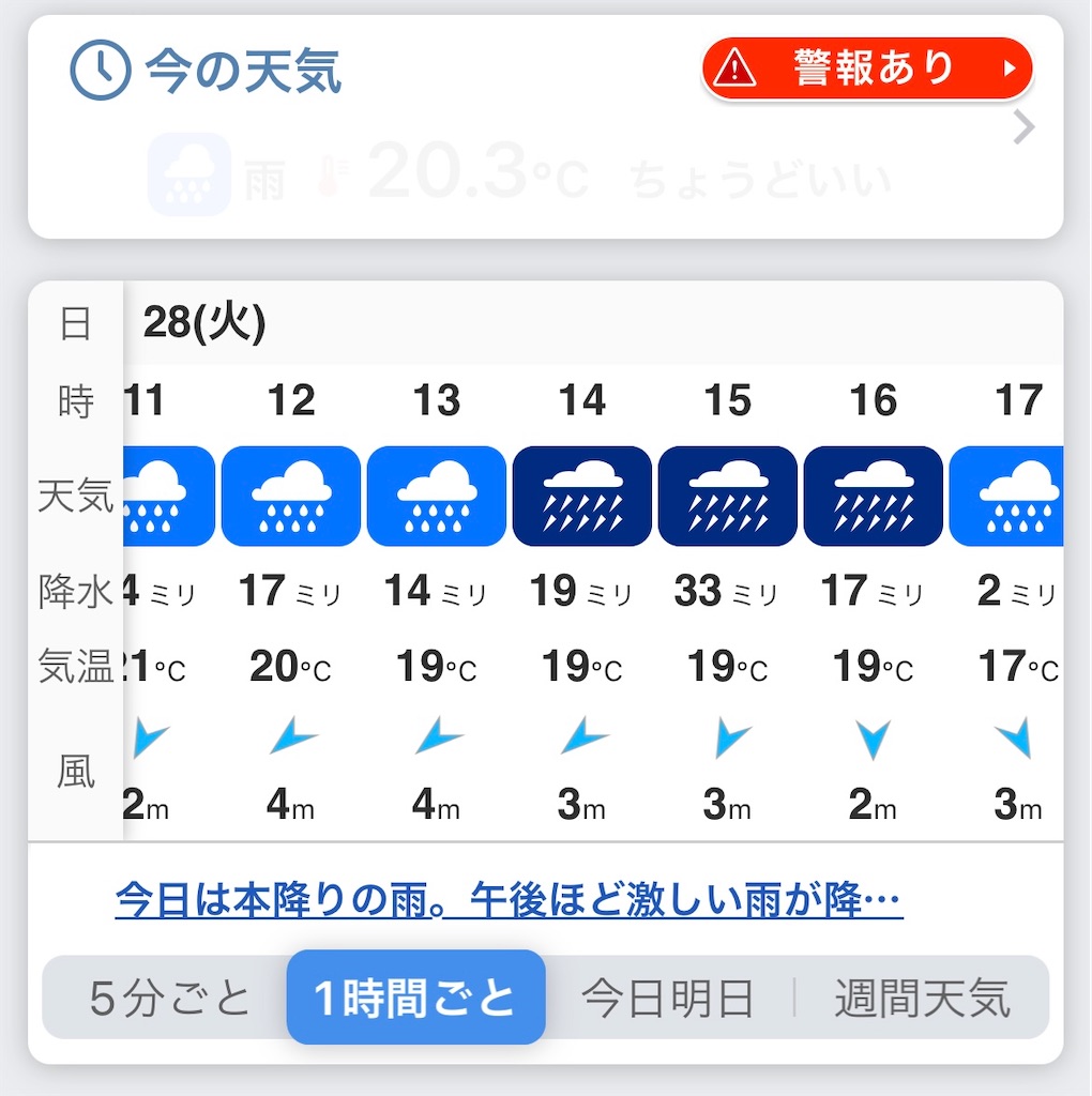 天気予報に見慣れない紺色のアイコンが並びました。土砂降りということですね。