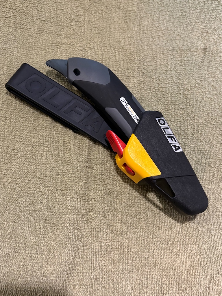 20周年記念の限定カラーのオルファのカッターです。ベルトに通す穴がついたホルダーがついていて、作業中にカッターの直す場所が出来ました。